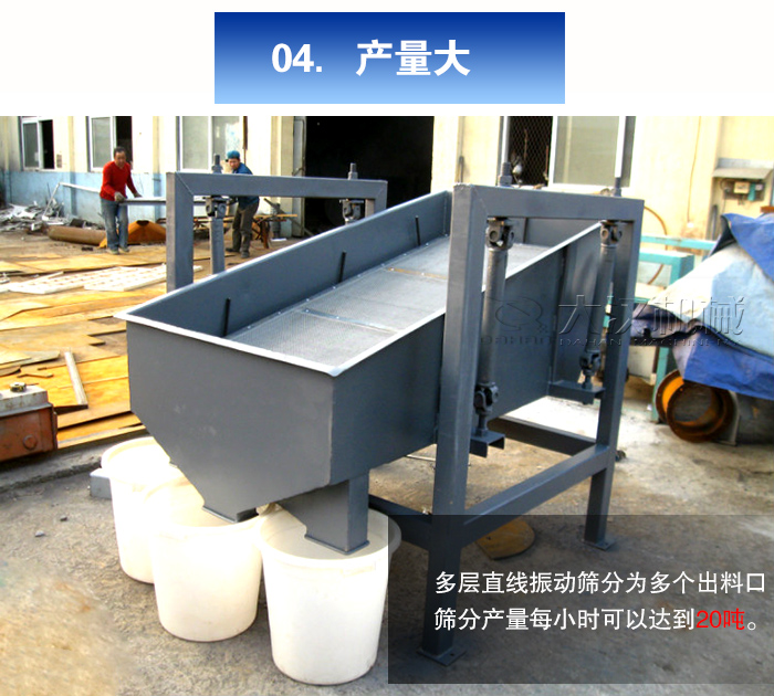多層直線振動篩分為多個出料口,可把篩分物料按大小粒度分為多個等級,物料篩分規(guī)格多,篩分后的物料可以自動排出,采用雙臺電機驅動,振動力更強,物料篩分更徹底,篩分產(chǎn)量每小時可以達到20噸。