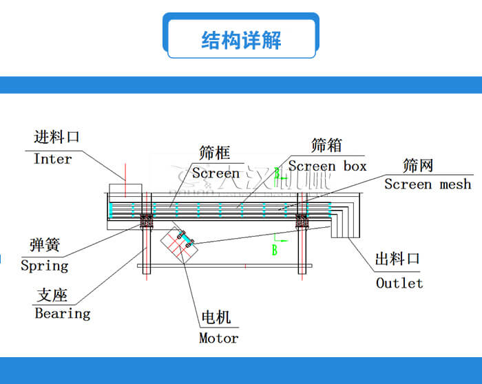 主要由篩箱、篩框、篩網(wǎng)、振動(dòng)電機(jī)、電機(jī)臺(tái)座、減振彈簧、支架等部分組成。