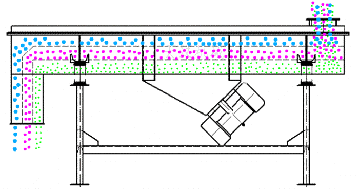 碳鋼直線振動(dòng)篩結(jié)構(gòu)主要由篩箱、篩框、篩網(wǎng)、振動(dòng)電機(jī)、電機(jī)臺(tái)座、減振彈簧、支架等組成。采為雙振動(dòng)電機(jī)驅(qū)動(dòng),當(dāng)物料從給料機(jī)均勻地進(jìn)入篩分機(jī)的進(jìn)料口時(shí),兩臺(tái)電機(jī)通過同步、反向旋轉(zhuǎn)時(shí)所產(chǎn)生的激振力在平行于電機(jī)軸線的方向相互抵消,在垂直于電機(jī)軸的方向疊為一合力,在激振力和物料自重力的共同作用下,使物料在篩面上被拋起向前作直線運(yùn)動(dòng),物料通過多層篩網(wǎng)產(chǎn)生數(shù)種規(guī)格的篩上物、篩下物,然后又分別從各自的出口排出,從而達(dá)到篩分的目的。