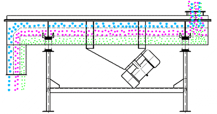 小型直線振動(dòng)篩主要由篩箱、篩框、篩網(wǎng)、振動(dòng)電機(jī)、電機(jī)臺(tái)座、減振彈簧、支架等組成。小型直線篩采用雙電機(jī)驅(qū)動(dòng),當(dāng)兩臺(tái)振動(dòng)電機(jī)做同步、反向旋轉(zhuǎn)時(shí),其偏心塊所產(chǎn)生的激振力在平行于電機(jī)軸線的方向相互抵消,在垂直于電機(jī)軸的方向疊為一合力,因此篩機(jī)的運(yùn)動(dòng)軌跡為一直線。兩電機(jī)軸相對(duì)篩面在垂直方向有一傾角,在激振力和物料自重力的合力作用下,物料在篩面上被拋起跳躍或向前作直線運(yùn)動(dòng),從而達(dá)到對(duì)物料進(jìn)行篩選和分級(jí)的目的。