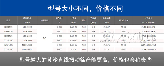 該設(shè)備型號有多種,每種型號的設(shè)備效率、產(chǎn)能、電機(jī)功率等各不樣,型號越大的黃沙直線振動(dòng)篩產(chǎn)能更高,價(jià)格也會稍貴些,不過給客戶帶來的經(jīng)濟(jì)利潤將會更顯著。