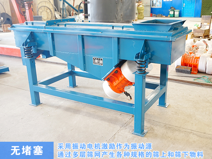 直線振動篩采用振動電機激勵作為振動源,使物料在篩網上拋起,同時直線前進。物料從進料器均勻進入篩選機進料口,通過多層篩網產生各種規(guī)格的篩上和篩下物料,分別從各自的出口排出,不存在堵塞現象,產量高。